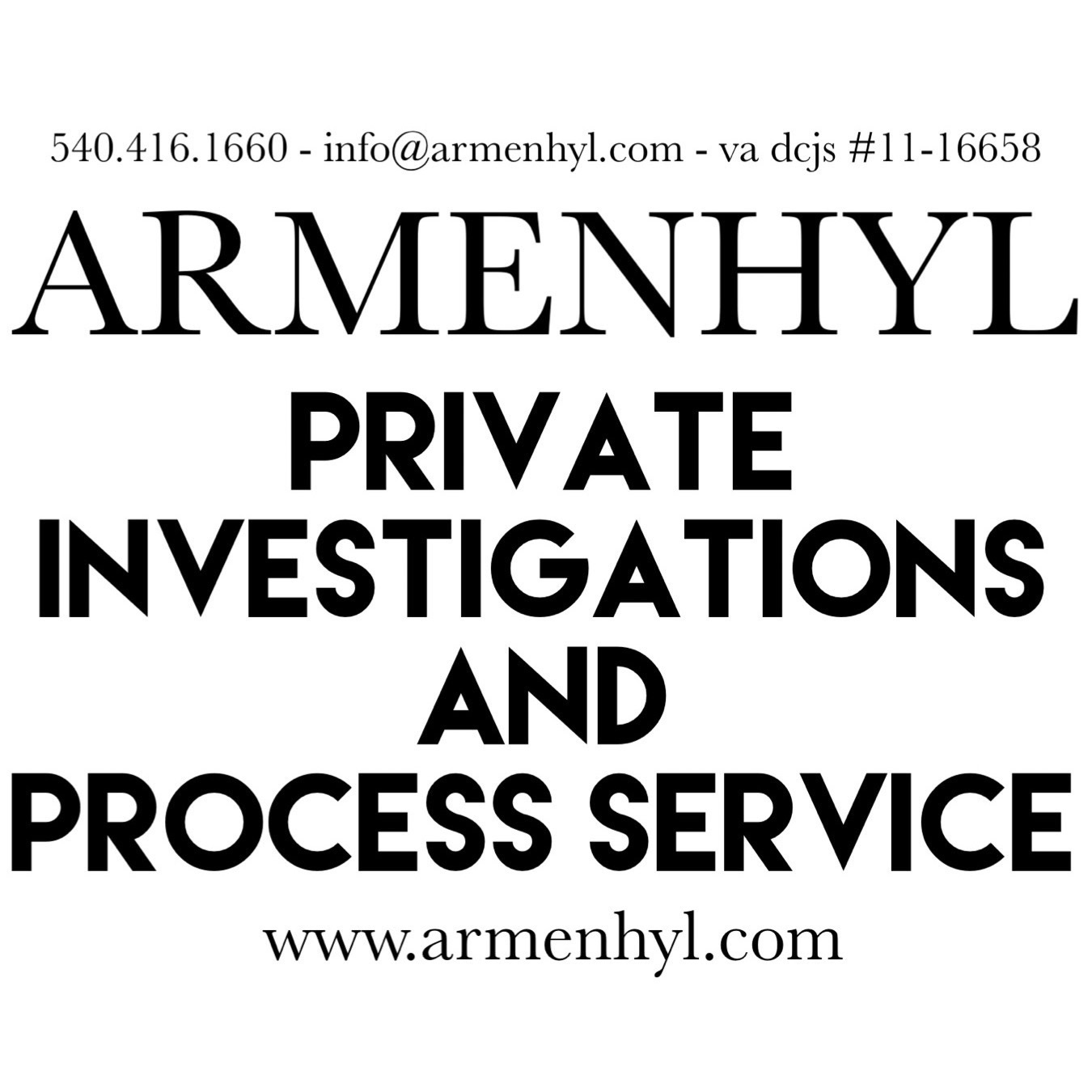 ARMENHYL is licensed with The Virginia Department of Criminal Justice Services [ # 11-16658 ] and The West Virginia Secretary of State [ F220131009608 ] for Private Investigation and Armed Security.